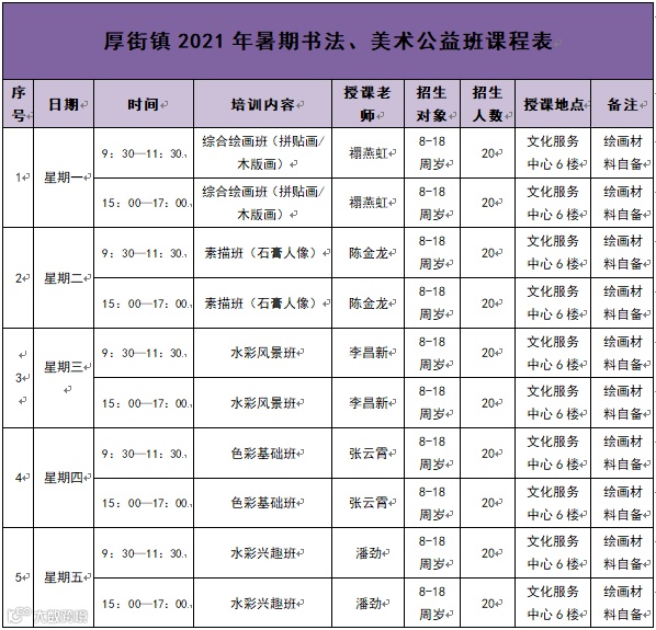 东莞市文化馆厚街分馆2021年暑期书法、美术公益培训班属政府公共文化服务项目,免收任何费用,学员须自备绘画材料。