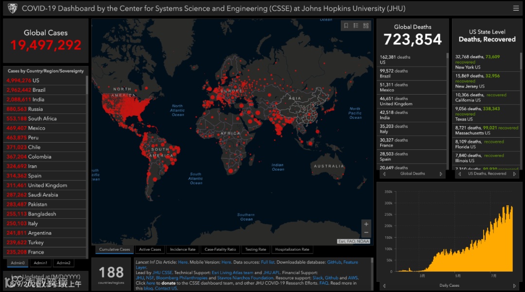 据约翰斯·霍普金斯大学统计数据,截至北京时间8月9日7时34分,全球累计确诊病例近1950万,为19497292例;累计病亡人数超过72万,为723854例。
