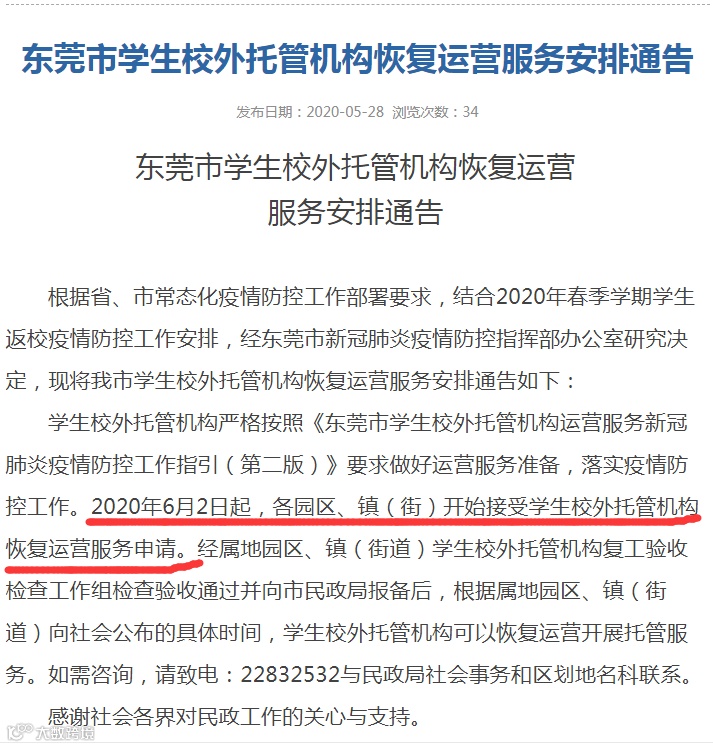 通告指出,根据省、市常态化疫情防控工作部署要求,结合2020年春季学期学生返校疫情防控工作安排,经东莞市新冠肺炎疫情防控指挥部办公室研究决定,我市学生校外托管机构严格按照《东莞市学生校外托管机构运营服务新冠肺炎疫情防控工作指引(第二版)》要求做好运营服务准备,落实疫情防控工作。
