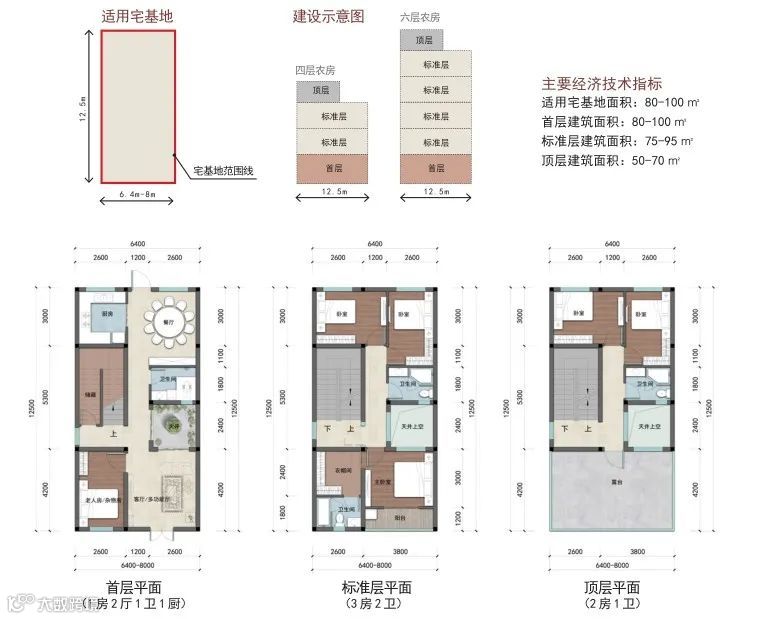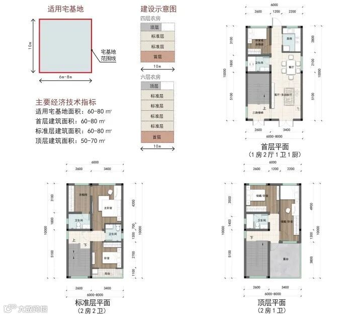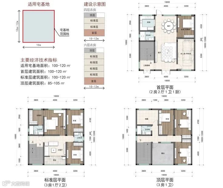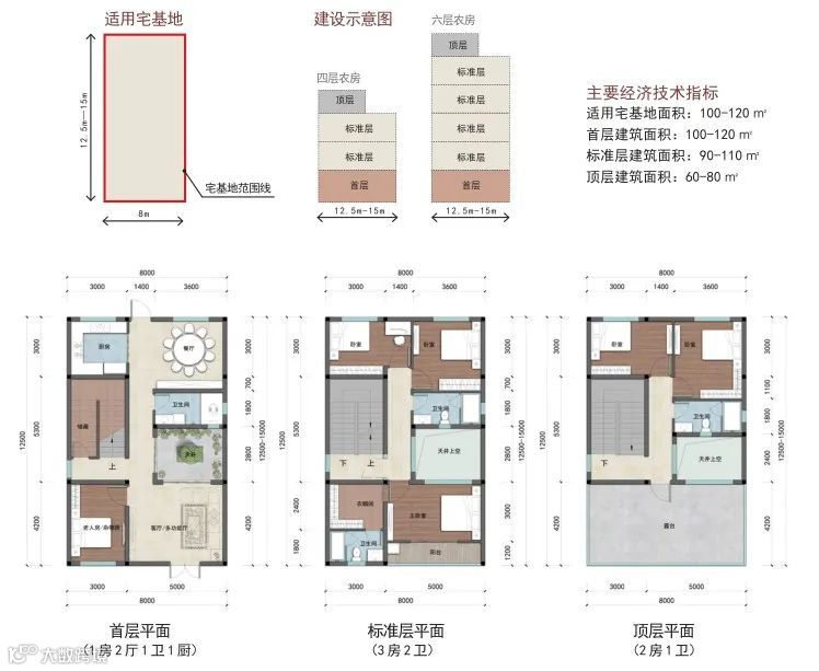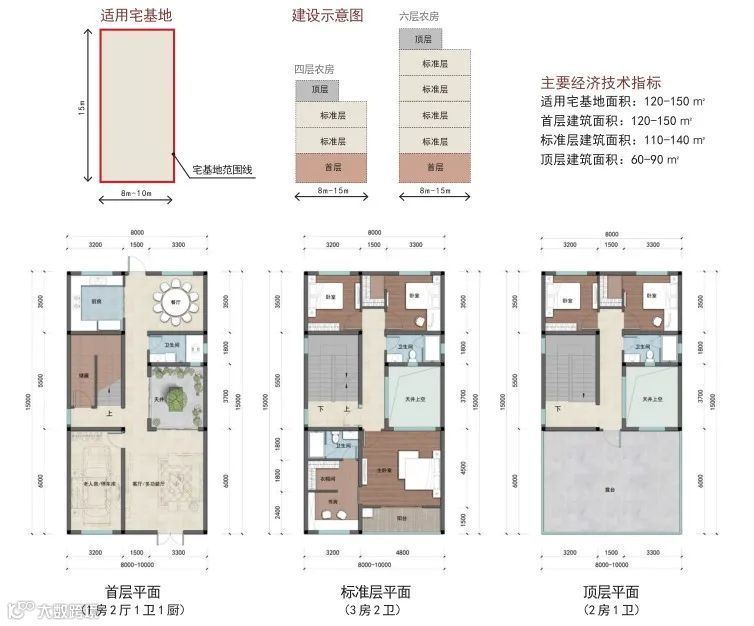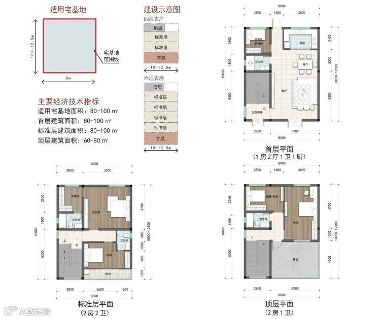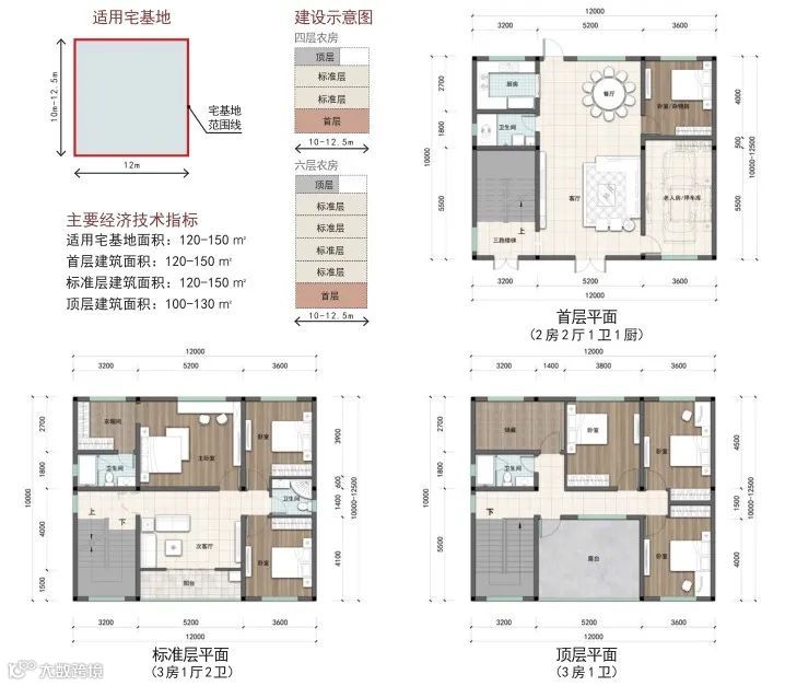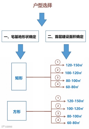 户型篇则分为矩形和方形两种户型,每种户型按照宅基地面积120-150 ㎡、100-120 ㎡、80-100 ㎡、60-80 ㎡进行设计。