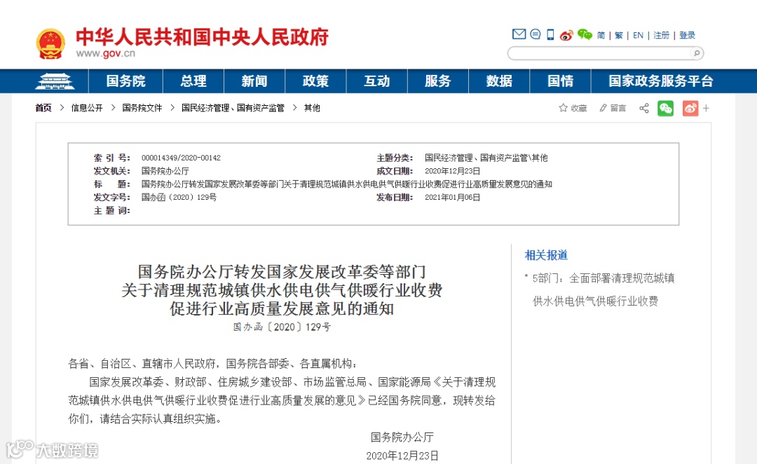 近日,国务院办公厅转发《国家发展改革委 财政部 住房城乡建设部 市场监管总局 国家能源局关于清理规范城镇供水供电供气供暖行业收费促进行业高质量发展的意见》。