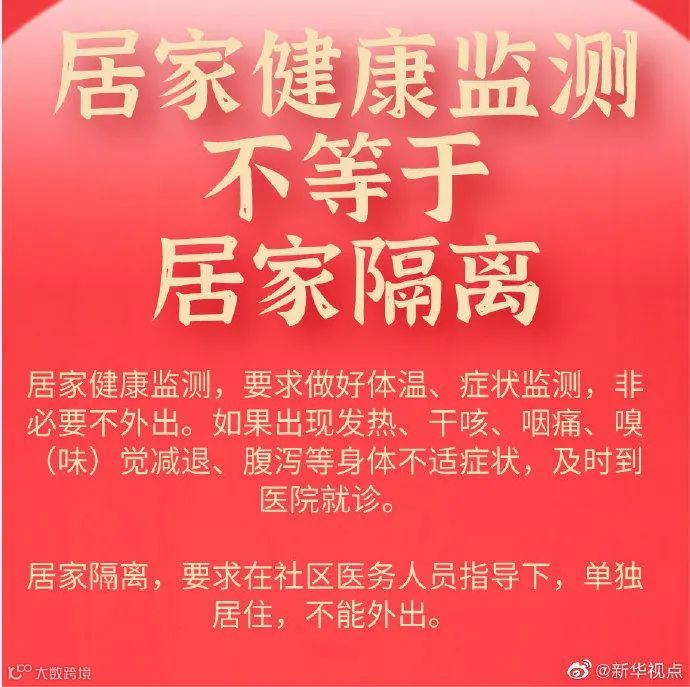 居家健康监测,要求做好体温、症状监测,非必要不外出。如果出现发热、干咳、咽痛、嗅(味)觉减退、腹泻等身体不适症状,及时到医院就诊。