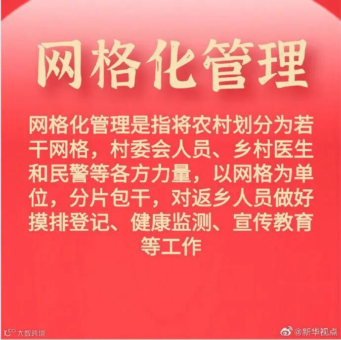 网格化管理是指将农村划分为若干网格,村委会人员、乡村医生和民警等各方力量,以网格为单位,分片包干,对返乡人员做好摸排登记、健康监测、宣传教育等工作。