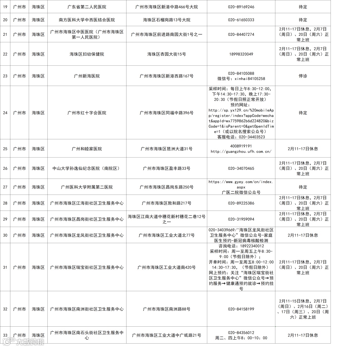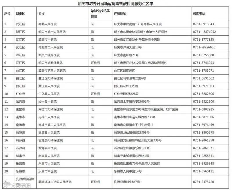 20日,韶关市卫生健康局公布对外开展新冠病毒核酸检测服务点名单。