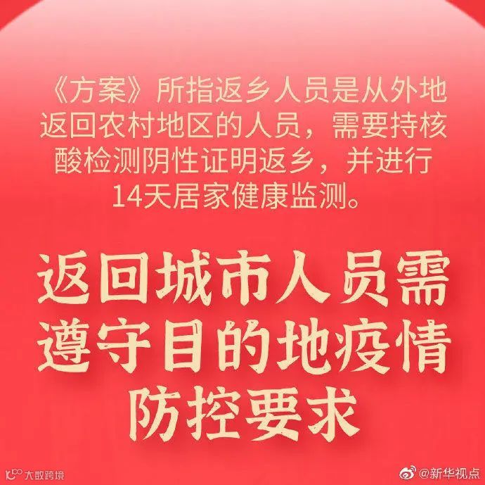 《方案》所指返乡人员是指从外地返回农村地区的人员,需要持核酸检测阴性证明返乡,并进行14天居家健康监测。