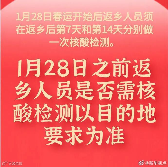 1月28日之前返乡人员是否需核酸检测以目的地要求为准。
