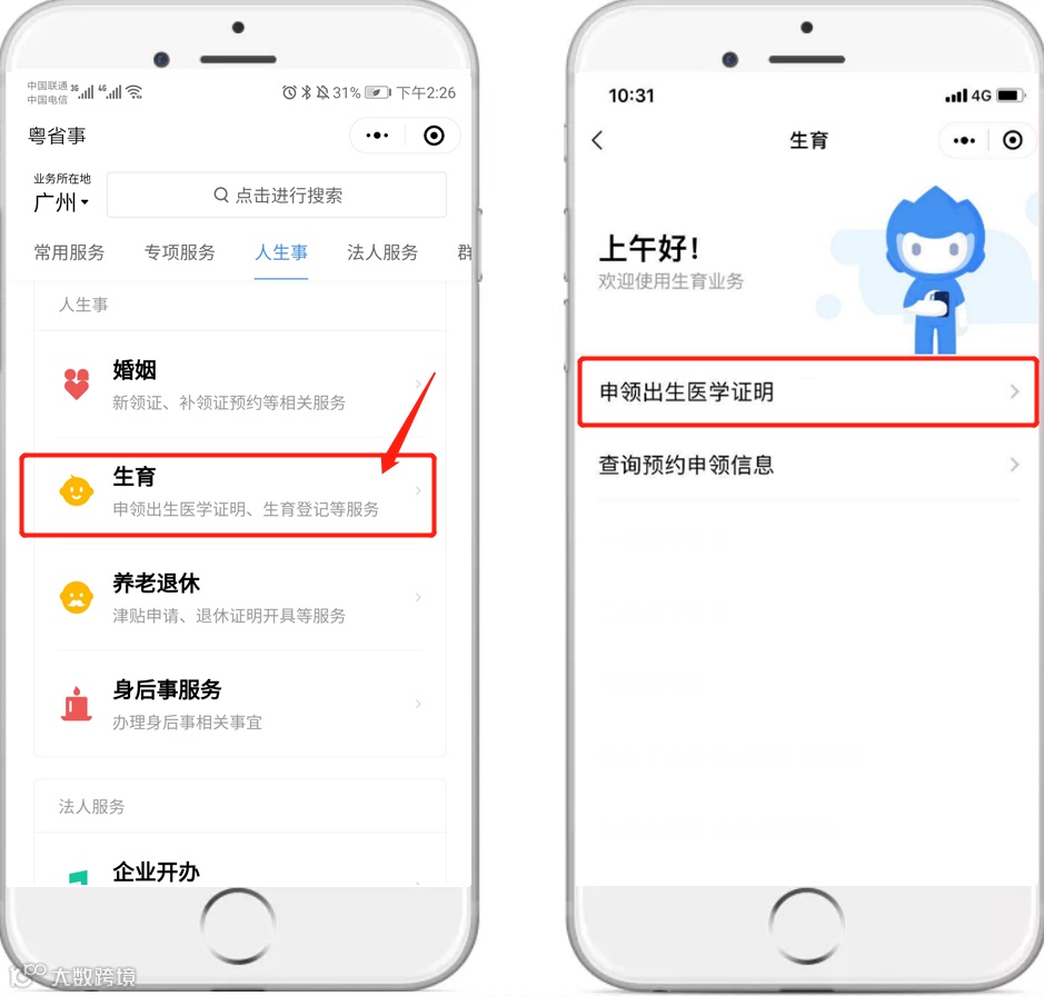 (1)微信小程序搜索进入:微信搜索“粤省事”小程序,进入小程序首页左上角切换所在城市,点击右上角放大镜图标搜索“出生证”等关键词。
