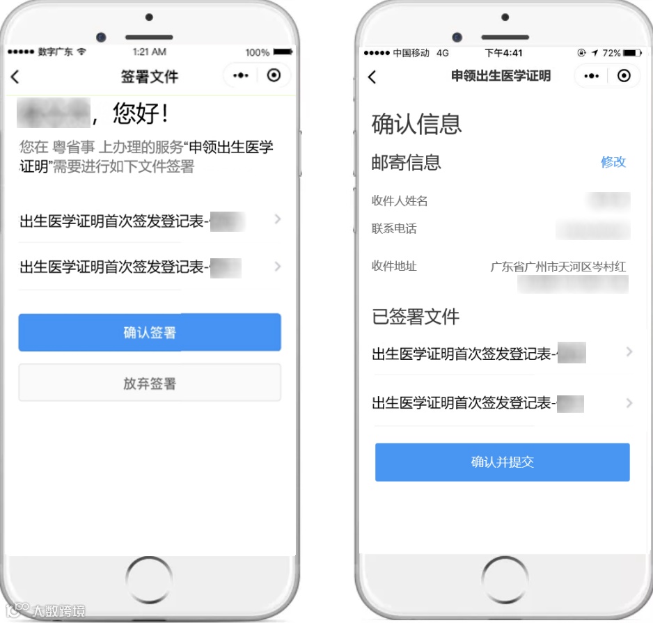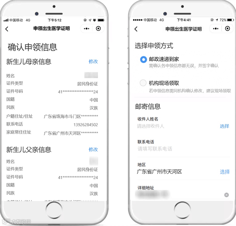 邮政速递:需确认申领信息无误,准确填写邮寄信息(姓名、地址、电话),且移动端进行《出生医学证明首次签发登记表》的电子签名,待证件制作完毕后,邮政速递人员送证上门并收取邮寄费用;