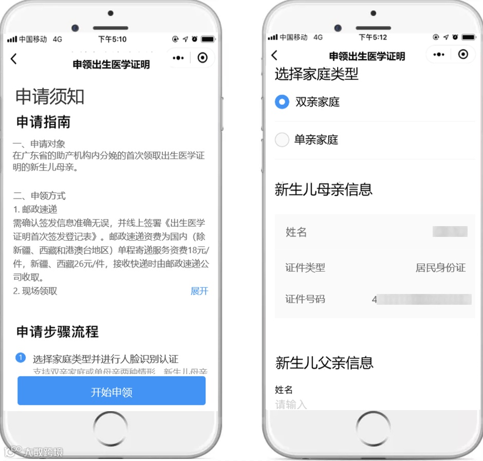 阅读申请须知,点击“开始申领”,选择新生儿信息及家庭类型,只有一胎(一个或多个小孩)时,无需选择新生儿。
