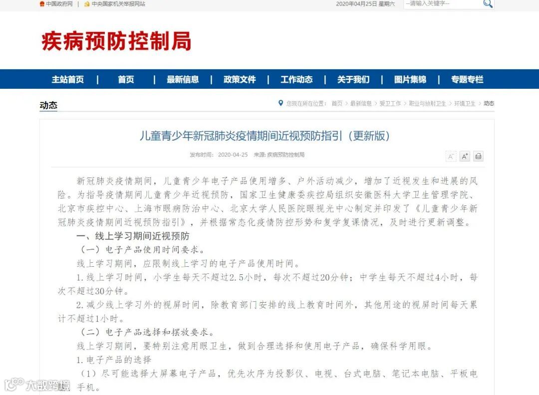 4月25日,为指导疫情期间儿童青少年近视预防,国家卫健委发布了《儿童青少年新冠肺炎疫情期间近视预防指引(更新版)》,国家卫健委对中小学生线上学习时间做出限制,小学生每天不超过2.5小时,每次不超过20分钟;中学生每天不超过4小时,每次不超过30分钟。减少线上学习外的视屏时间,除教育部门安排的线上教育时间外,其他用途的视屏时间每天累计不超过1小时。
