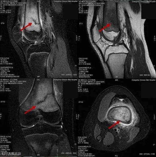 无独有偶,很快,又有三名同学陆续来院就诊,他们的情况与罗同学完全一样,都是 14~15 岁的初中生,在学校参加跑步等体育锻炼后出现膝关节疼痛,并加重后就诊,经磁共振成像检查,同样为应力性骨折。