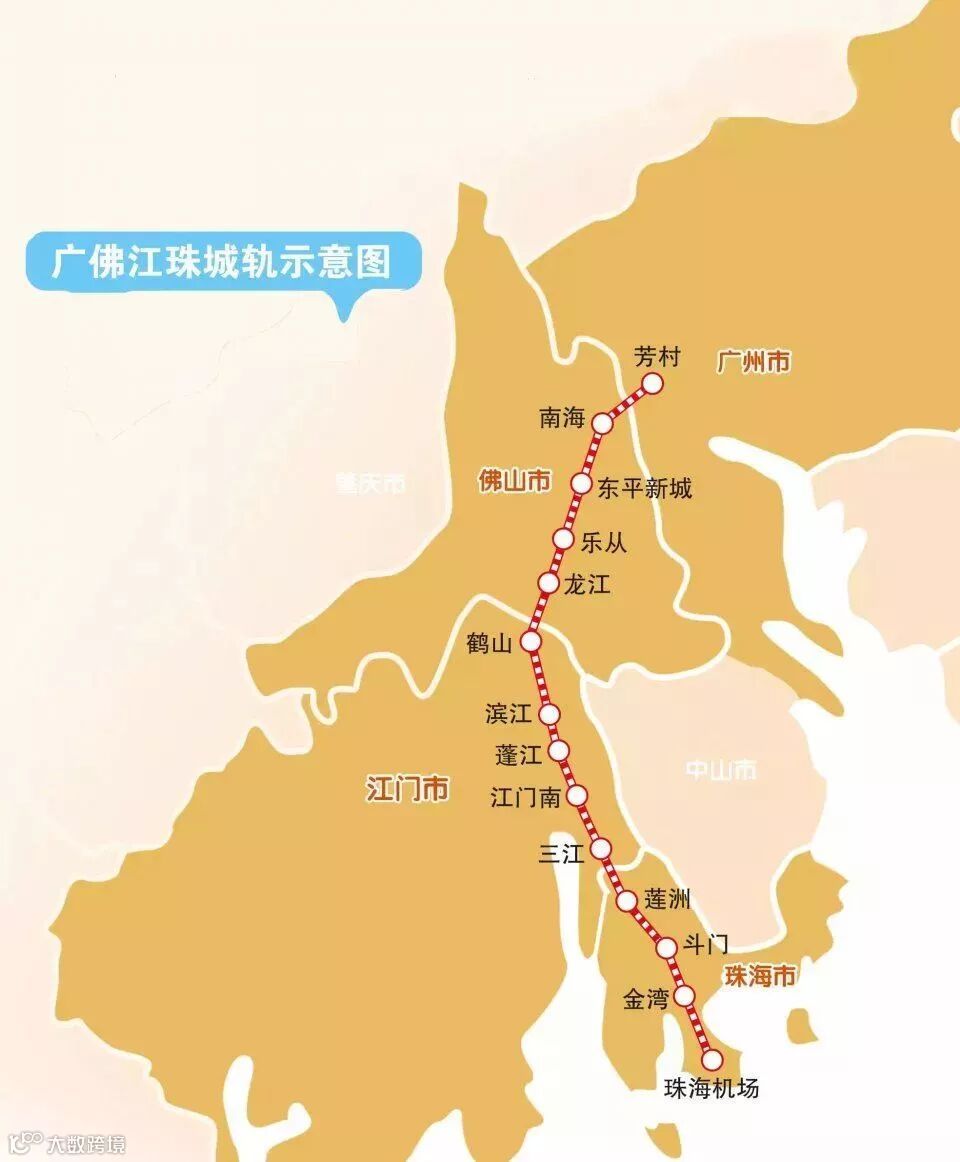 广佛江珠城轨:途经广州、佛山、江门、珠海4市,目前在建设中。建成通车后,江门市区到广州市区仅需30分钟,且可与广州地铁及穗莞深线实现直接换乘。