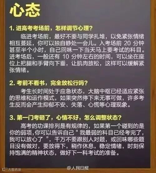 一般考前,考生的心理状态可以分为以下几种,首先是松散状态,二是紧张状态,三是平和状态,四是兴奋状态。拥有一个好心态是高考成功的关键,有一些小的建议要和大家分享: