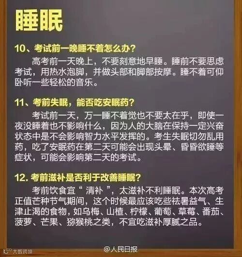 睡眠状况直接影响着身体状态,从考前一个星期开始,就应该把调整睡眠放在重要的位置上。有些考生由于紧张、生物钟紊乱等原因,考前会失眠,这里就提出一些应对措施: