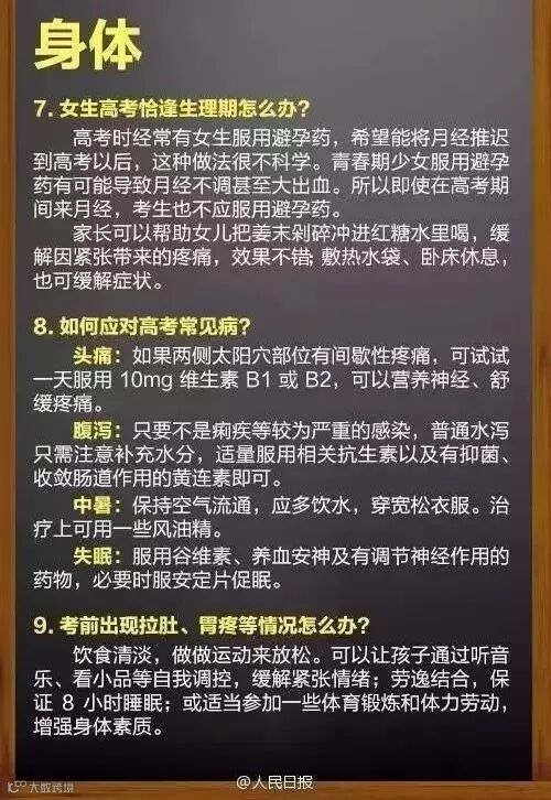 高考前切忌乱进补,安排好考前考中营养。考前大量的进补,容易紊乱孩子内分泌,一不小心还会引起上火等问题。营养应注意均衡,荤素合理搭配。