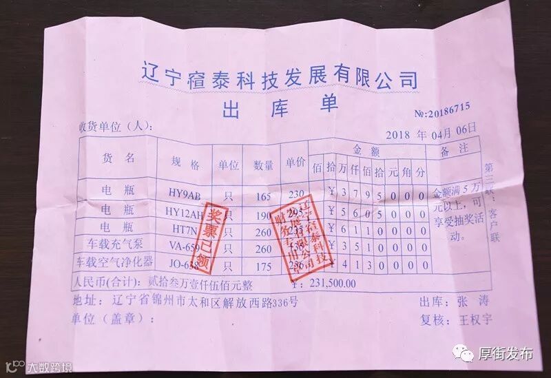 一开始让莫先生对自己获奖深信不疑,因为夹在抽奖卡中间的出库单上面标明共计购买电瓶、车载充气泵等货23万余元,并在备注上写着“金额满5万元以上,可享受抽奖活动”,按道理凭票的确可以领取四张抽奖卡。