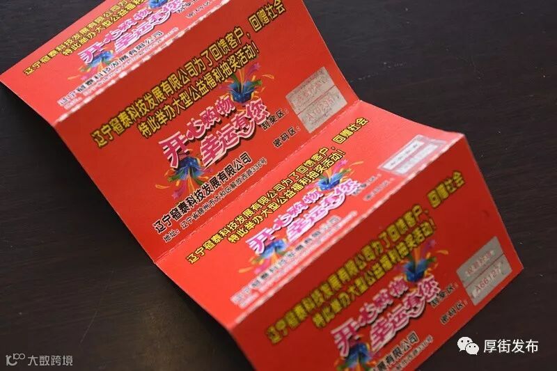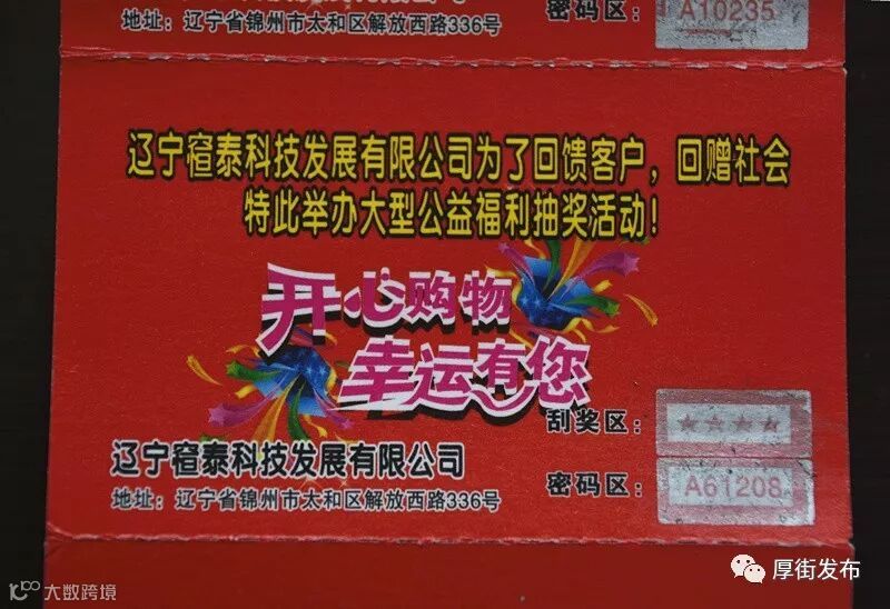 抽奖卡上的题头注明“辽宁某泰科技发展有限公司为了回馈客户,回赠社会特此举办大型公益福利抽奖活动”,落款就是辽宁某泰科技发展有限公司,抽奖卡中间印着“开心购物,幸运有您”,右下角是刮奖区和密码区。