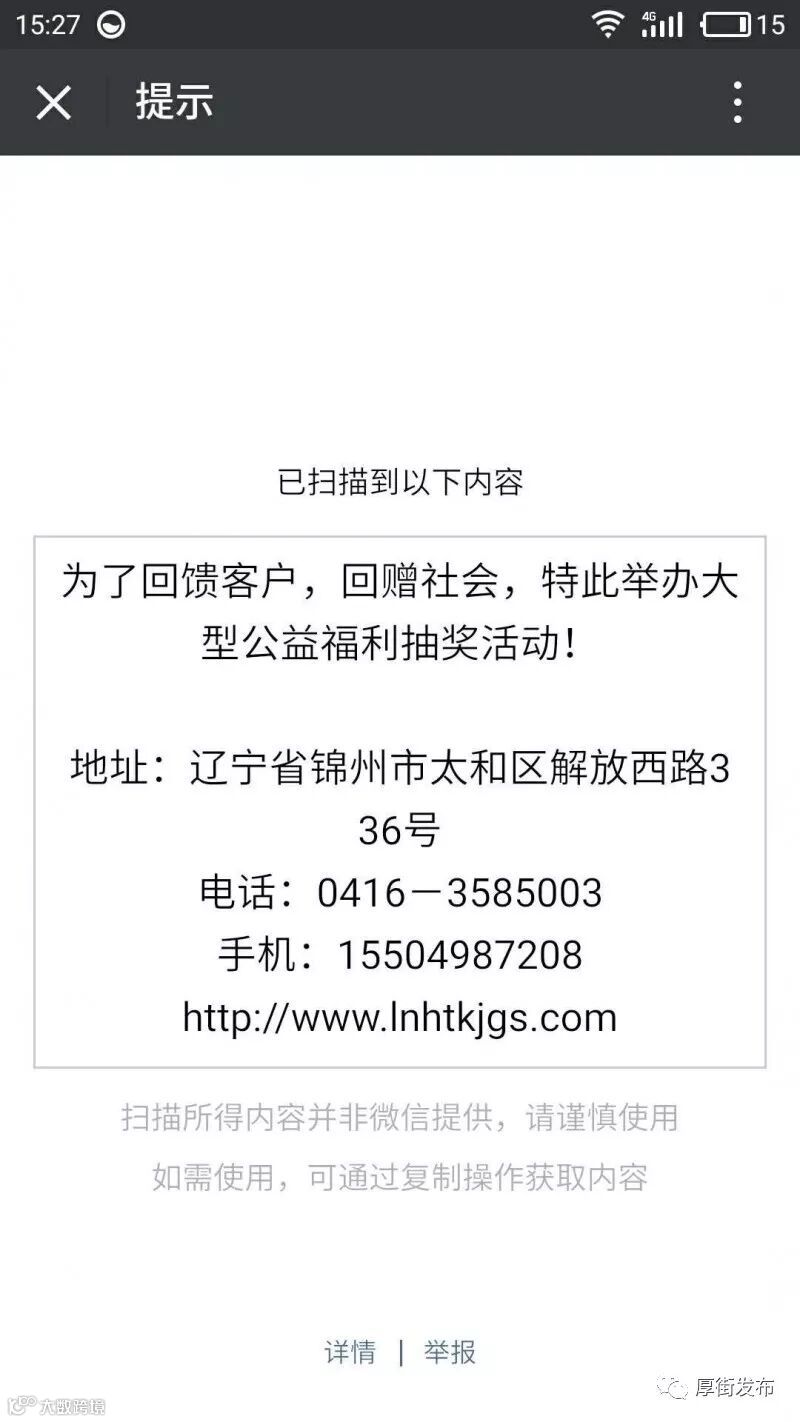 然而,弹出来的页面初露端倪:它不像是正规的领奖链接,而是出现地址、网站、手机号码等信息。