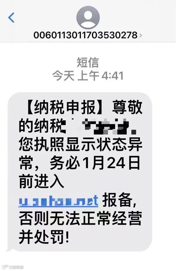 您好,近期东莞税务发现有不法分子冒用我局名义发送诈骗短信,短信内容主要为“【纳税申报】尊敬的纳税人***,你执照显示状态异常,务必1月25日前进入h.bxihy.net报备,否则无法正常经营并处罚!”,诱使短信接收人点击非法链接。若您收到类似短信,东莞税务提醒您请勿轻易点击相关网址链接,提高警惕,谨防上当受骗。