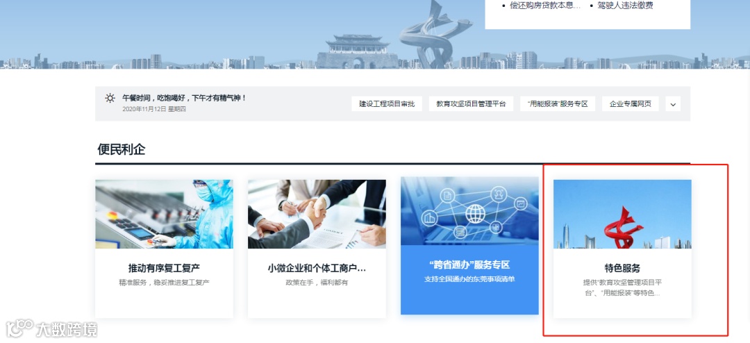 2.在弹出页面点击蓝色“广东政务服务网东莞市”,即可找到“特色服务”板块