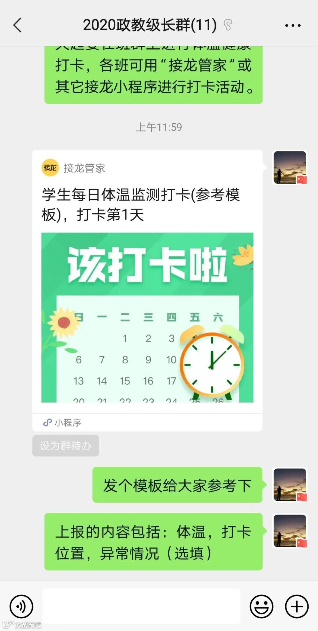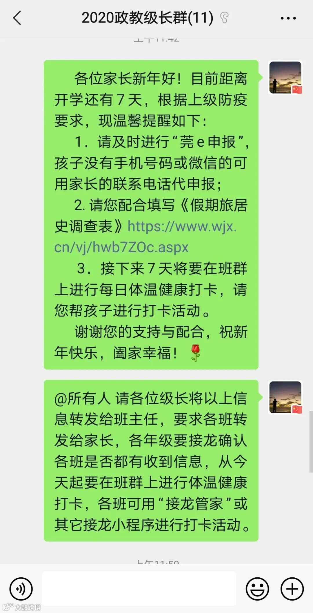 在师生员工返岗或返学前7天,要配合学校通过“问卷星”“接龙管家”“小管家”或自制小程序等便民手段开展包括旅居史和体温情况在内的全员登记和健康监测。