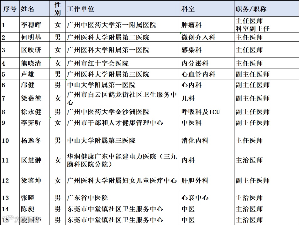 本次联合义诊科目涵盖中西医结合、内外科、儿科、肿瘤科、中医等多个科目。医生团队来自广东省人民医院、中山医科大学各附属医院、广州中医药大学和广州医科大学各附属医院等医疗机构的医学教授、科室负责人、主治医师。