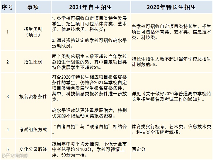 从往年单一的“特长生招生”转变为多元化的“自主招生”,2021年普高学校自主招生包含两个类别:一是各学校可招收自定项目类特色发展学生;二是通过资格认定的学校可招收高水平运动队队员。