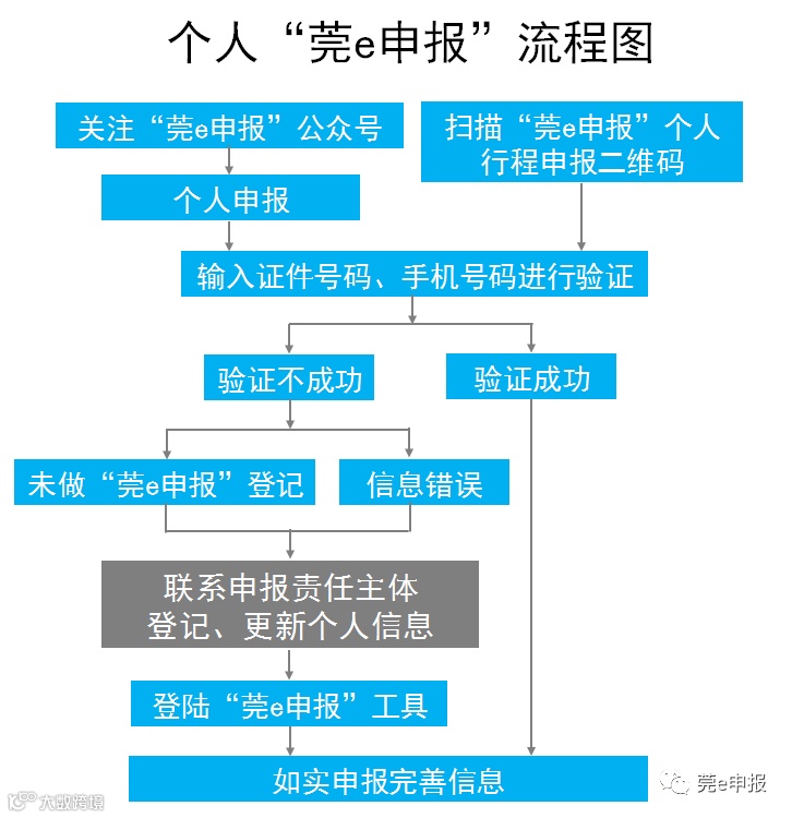 通过微信扫描“莞e申报”个人行程申报二维码(下图所示),输入信息进行验证→如实申报个人信息。