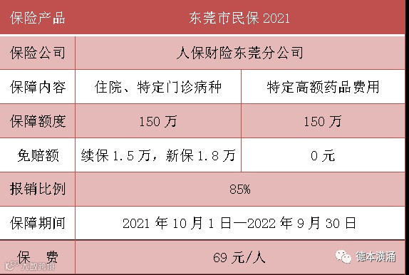 ● 东莞市民保是由人保财险承保的紧密衔接东莞医保政策的一款惠民类商业补充医疗保险,主要报销医保范围内的住院、特定门诊医疗费和30种特定药品费。