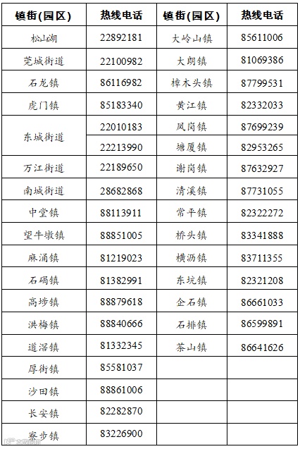 东莞市各镇街、松山湖疫情防控热线电话