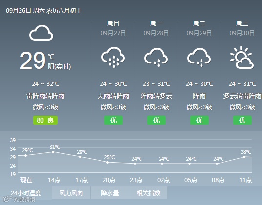 其中26日多云转雷阵雨,局部大雨,降雨集中在午后到夜间,