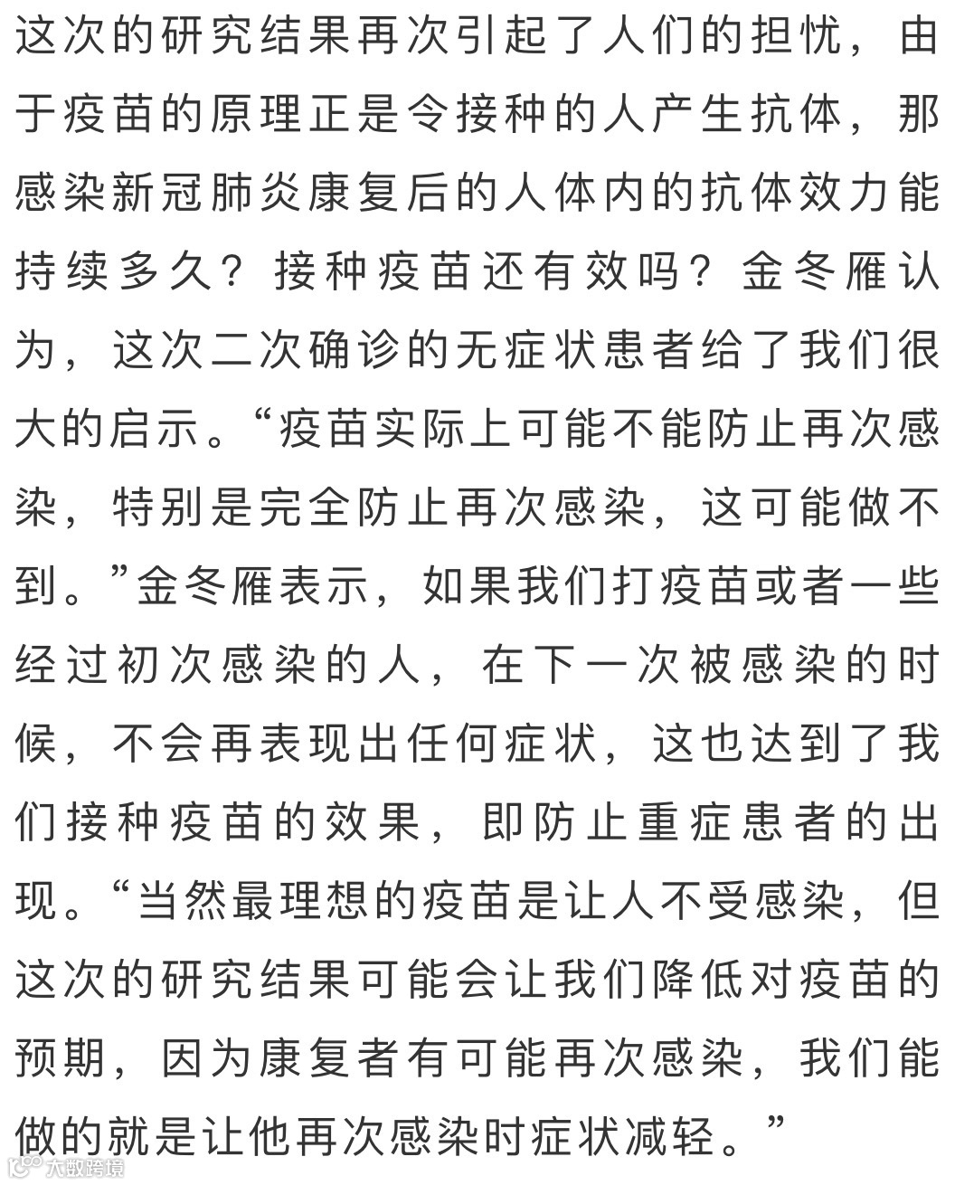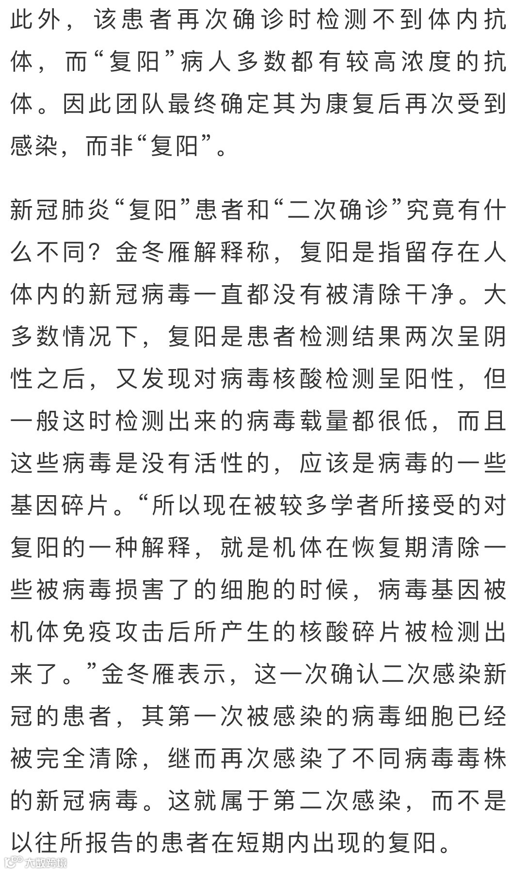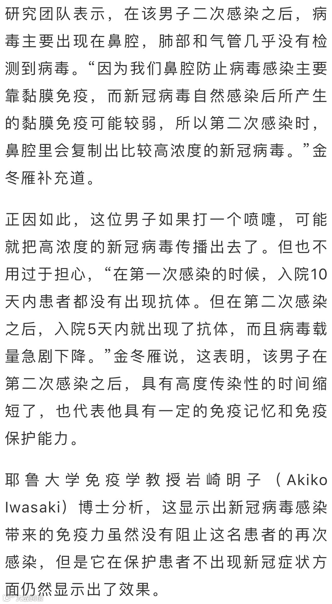 金冬雁指出,如果不是该患者在入境时被检测出呈阳性,没有人会发现他再次感染了新冠肺炎。这是因为上次感染之后的免疫记忆还在,新冠病毒可以进入人体,但没有进入其肺部,显现出症状。