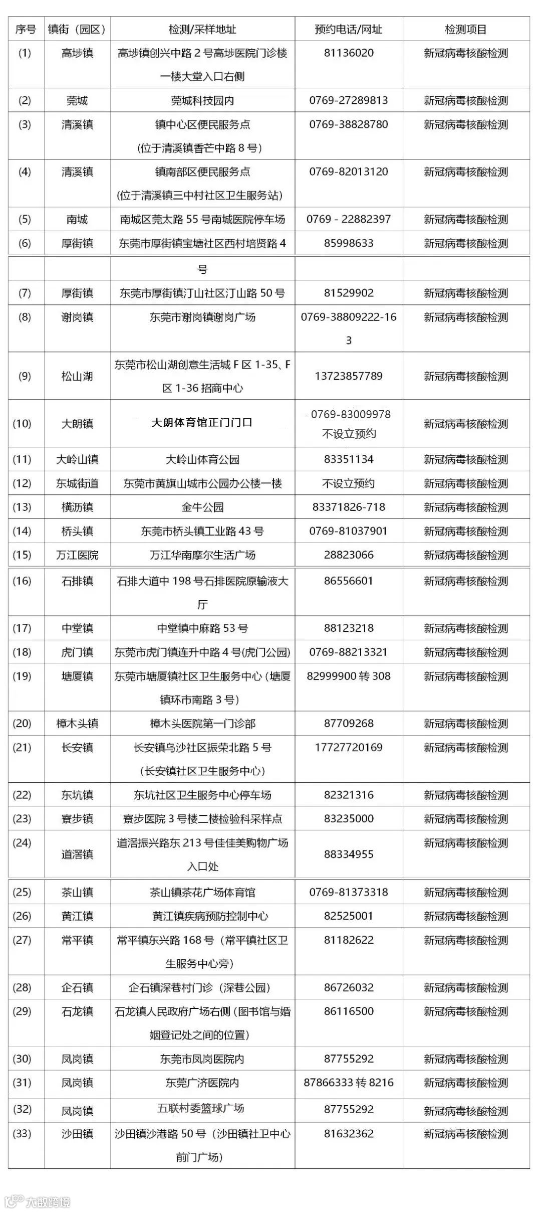 东莞市各镇街(园区)公共场合设立新冠病毒核酸采集便民服务点名单