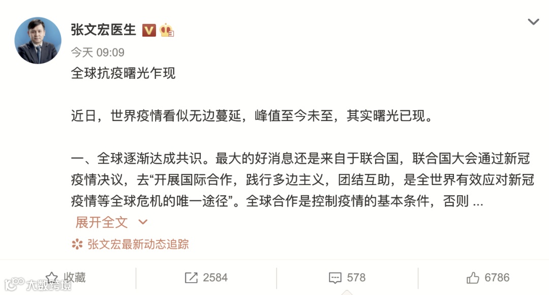 昨天,张文宏医生在其个人微博@张文宏医生 发布博文称,“近日,世界疫情看似无边蔓延,峰值至今未至,其实曙光已现。”