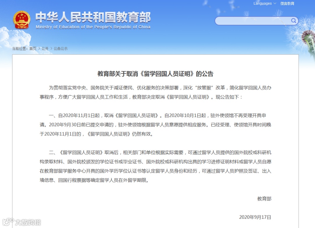 教育部关于取消《留学回国人员证明》的公告
