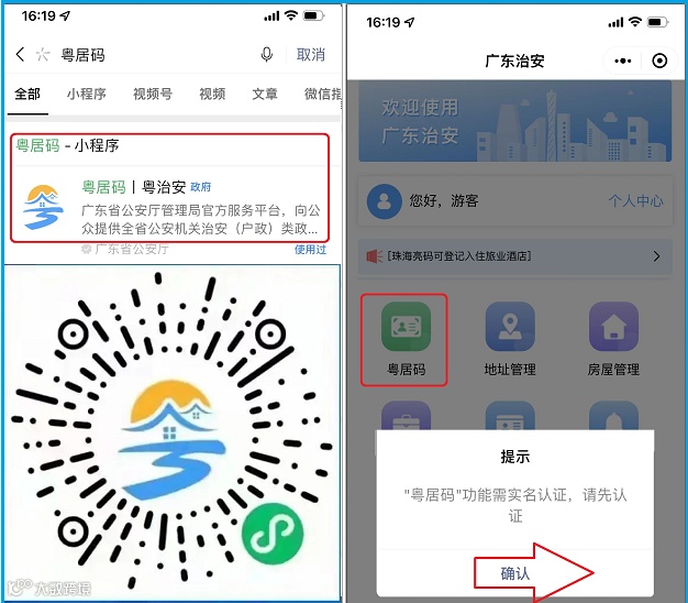 第一步:市民通过微信搜索小程序“粤居码”或扫描葵花码,打开“粤居码|粤治安”小程序。