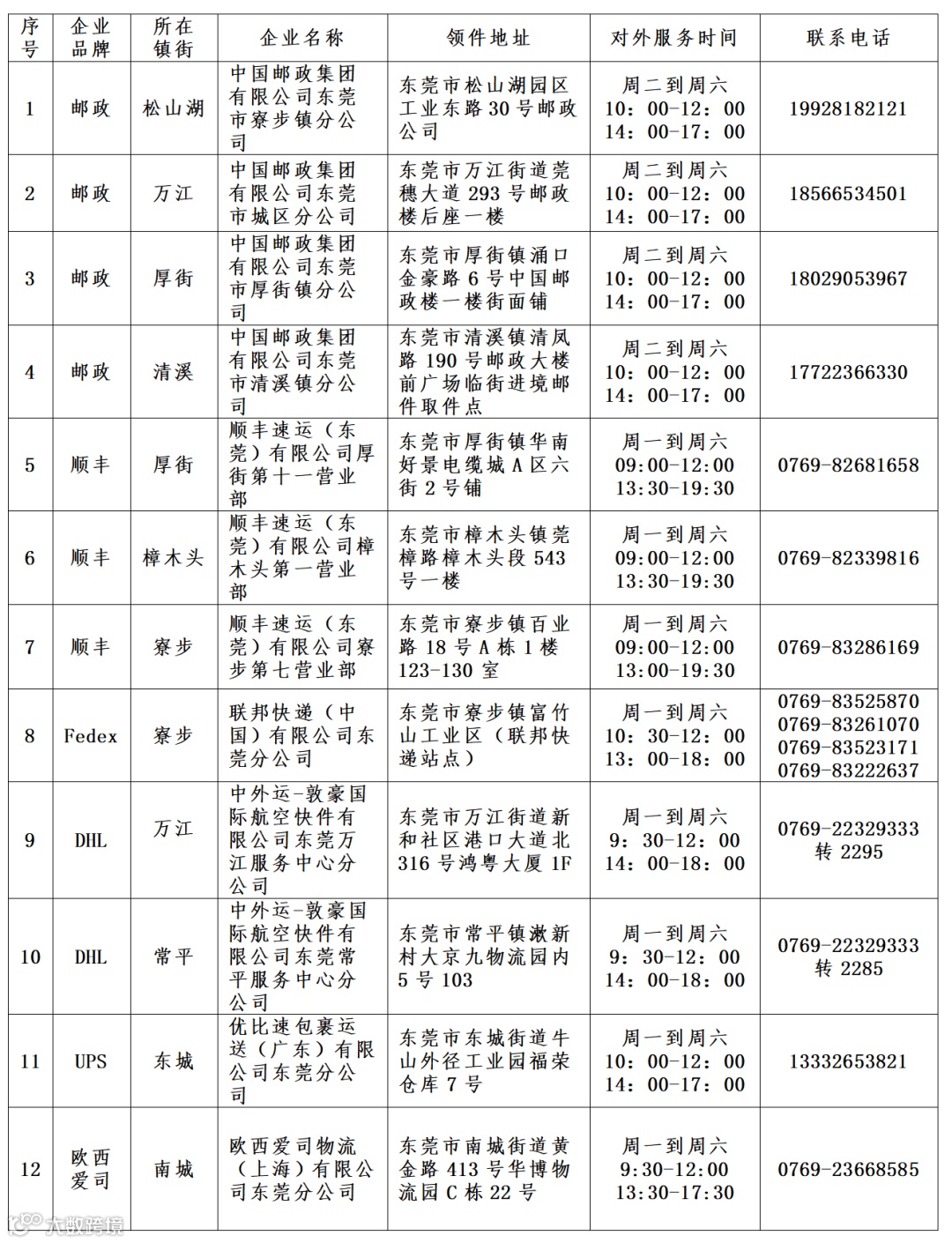 东莞市进境邮件快件集中取件点信息表