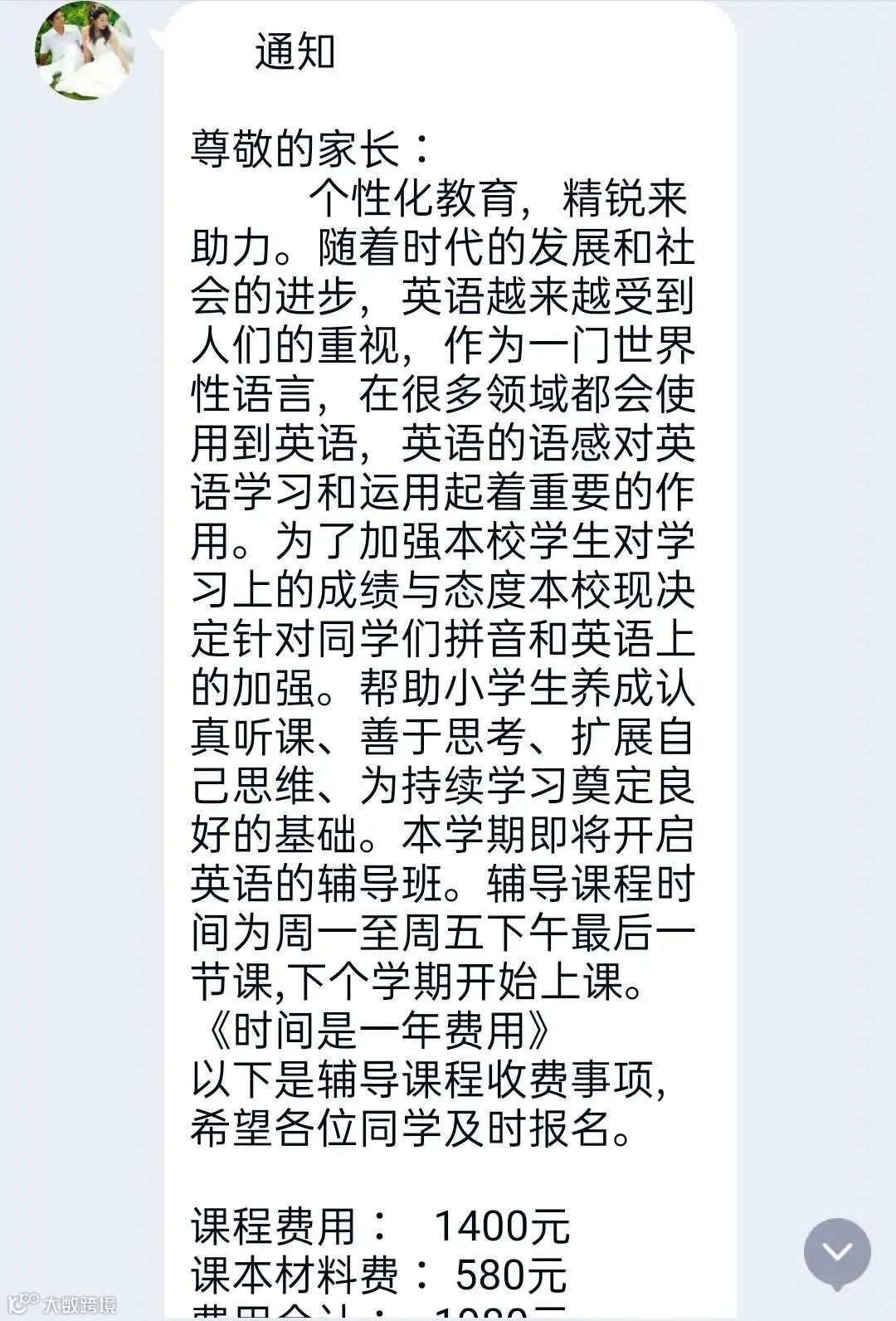 5月1日,东莞长安镇的刘女士收到“班主任老师”在孩子的班级QQ群中所发的通知:“返学在即,为加强学生英语水平,学校将开设英语辅导班,辅导费1400元,材料费580元。名额有限,先到先得,扫描二维码缴费。”