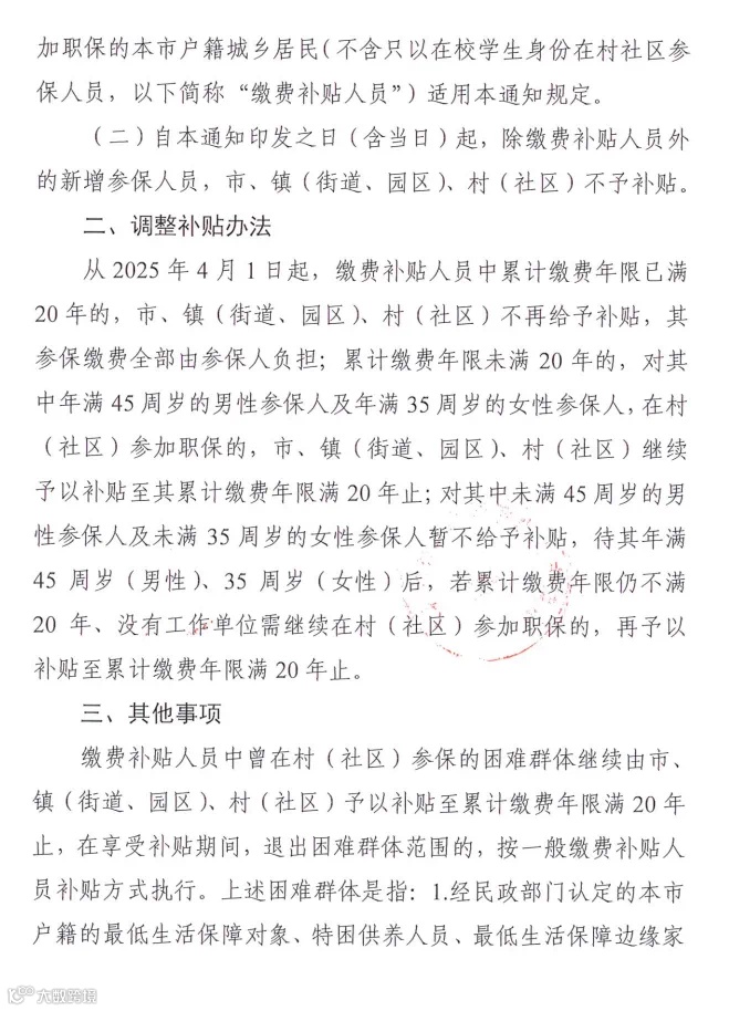 《通知》实施后:对2025年3月11日(含当日)后新增的参保人员、只以在校学生身份曾在村(社区)参保人员,以及职保累计缴费年限已满20年的人员,市、镇街(园区)、村(社区)不再给予财政补贴。对未满45周岁的男性参保人及未满35周岁的女性参保人,暂时不给予补贴,养老保险费全部由个人负担,待其年满45周岁(男性)、35周岁(女性)后,若累计缴费年限不满20年、没有工作单位需继续在社区参加职保的,再予以补贴至累计缴费年限满20年止。