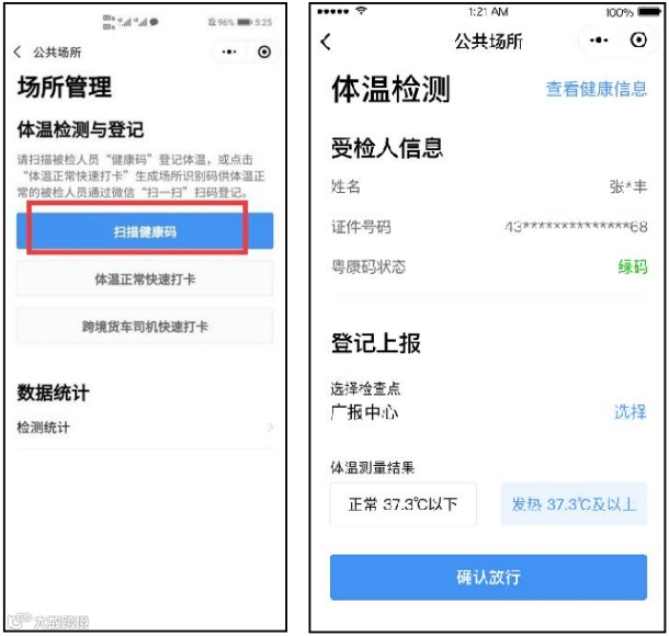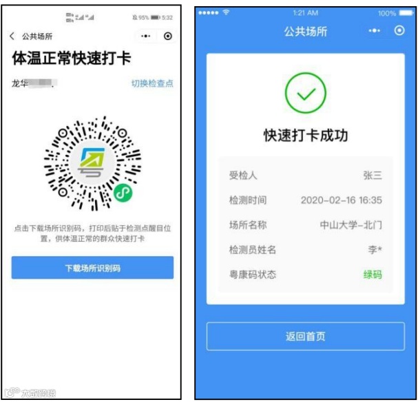 “体温正常快速打卡”功能:在群众被检测体温正常时,检测员无需扫码登记,可引导其用微信扫描快速打卡小程序码,即可快速打卡,默认体温正常。对未持智能手机或操作智能手机有困难的老人、小孩、残疾人等群体,可以让其同行亲朋好友代为出示或扫描其携带的实体“粤康码”。“粤康码”上方提供了添加和管理家庭成员功能,以及切换家庭成员“粤康码”的入口, 检测员可进行现场引导。