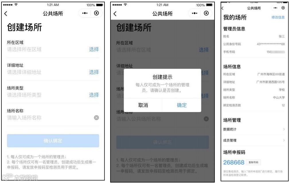 1) 创建公共场所:公共场所管理员扫描小程序码,进入公共场所管理员端(请注意不要与组织机构管理员端混淆),填写所在区域、详细地址、场所类型、场所名称,确认后即可创建成功(一个场所只能绑定一个管理员,一个管理员也只能创建一个 场所,管理员可同时绑定成为检测员)。