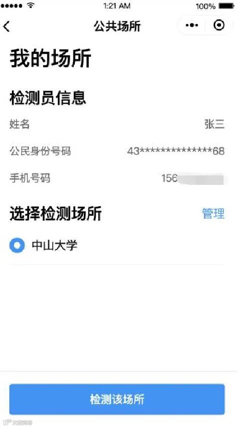 2) 管理我的场所:进入“我的场所”页面,可选择场所进入检测页面。点击“管理”进入场所管理页,支持新增绑定公共场所、解除绑定公共场所。