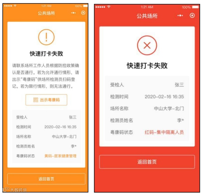 注意:“粤康码”红、黄码人员使用“体温正常快速打卡”功能时,将显示其粤康码并提示“快速打卡失败”。