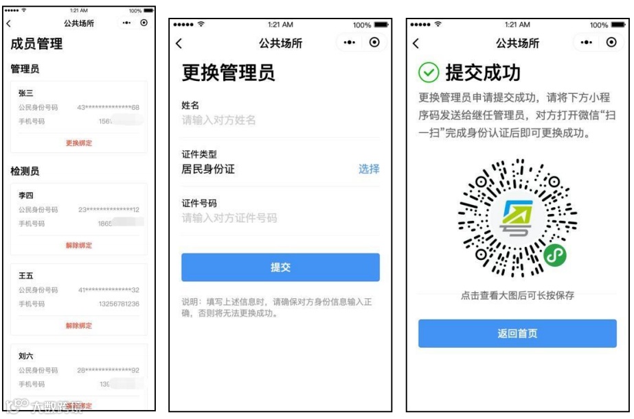4) 成员管理:公共场所管理员进入“成员管理”页面,可进行更换管理员、解绑检测员操作。