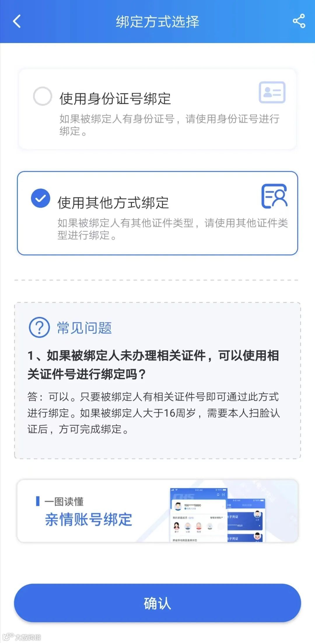 步骤2:请根据说明选择合适的绑定方式,然后点击【确认】按钮。仔细阅读告知书文字,按照要求填写信息,上传相关材料,完成绑定。