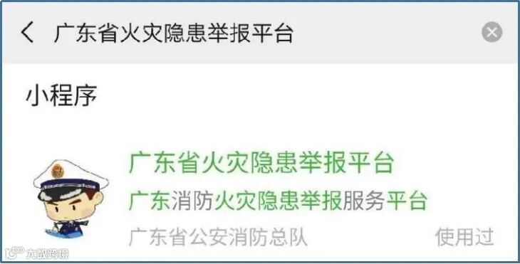 1.微信顶部搜索框搜索“广东省火灾隐患举报平台”微信小程序。