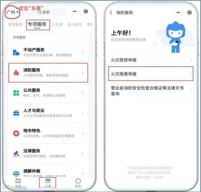 1.微信搜索登录粤省事小程序,点击“办事”页,下拉“专项服务”,选择“消防服务”,点击“火灾隐患举报”。