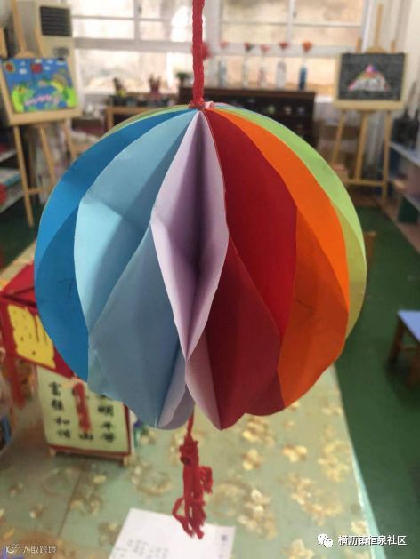 灯笼采用七色彩纸,做成五光十色犹如彩虹般的视觉效果,寓意新中国成立70周年,姹紫嫣红、流光溢彩。