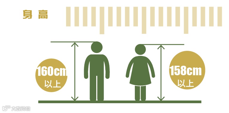 男性身高 160cm以上 ,女性身高 158cm以上 ,合格。不同兵种还有单独要求。