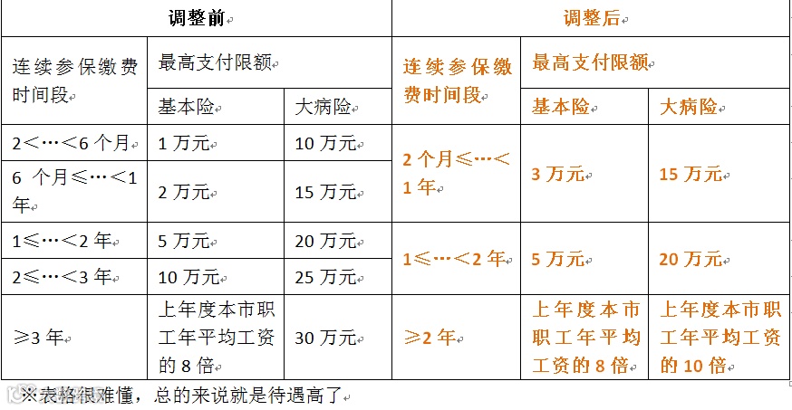 1.简化最高支付限额分段,将享受最高额度支付限额的条件从连续参保缴费满3年以上调整为满2年以上。大病保险最高支付限额提高到上年度全市职工年平均工资的10倍。